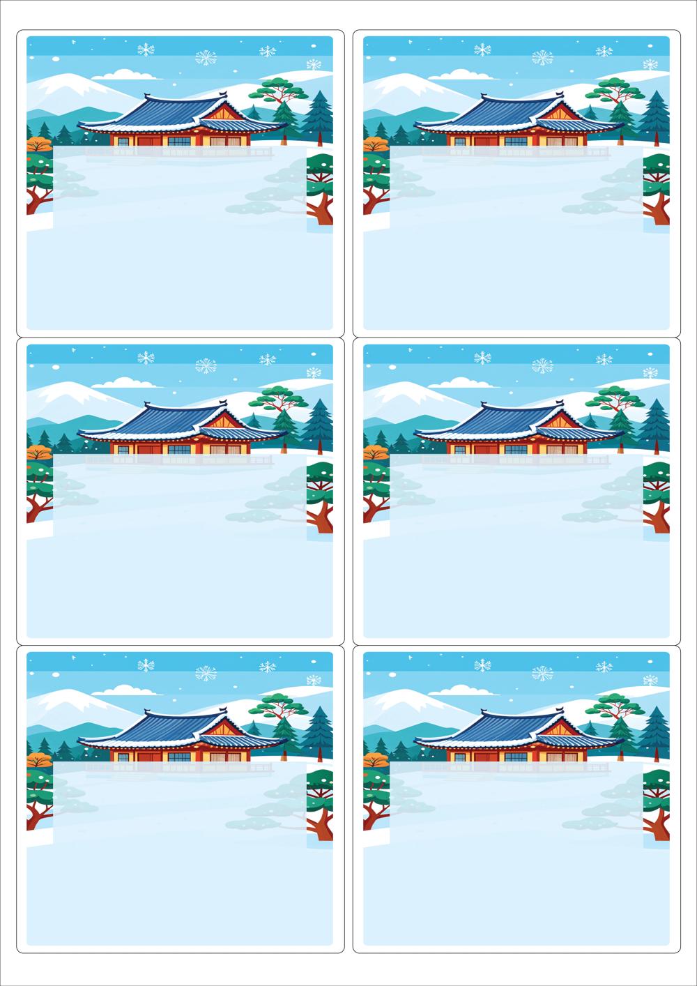 디자인된 A4 라벨지 출력용 라벨스티커, 규격코드: 223, 디자인코드: DA1567(설날의 아침1), 98.8 x 92.7 (mm)