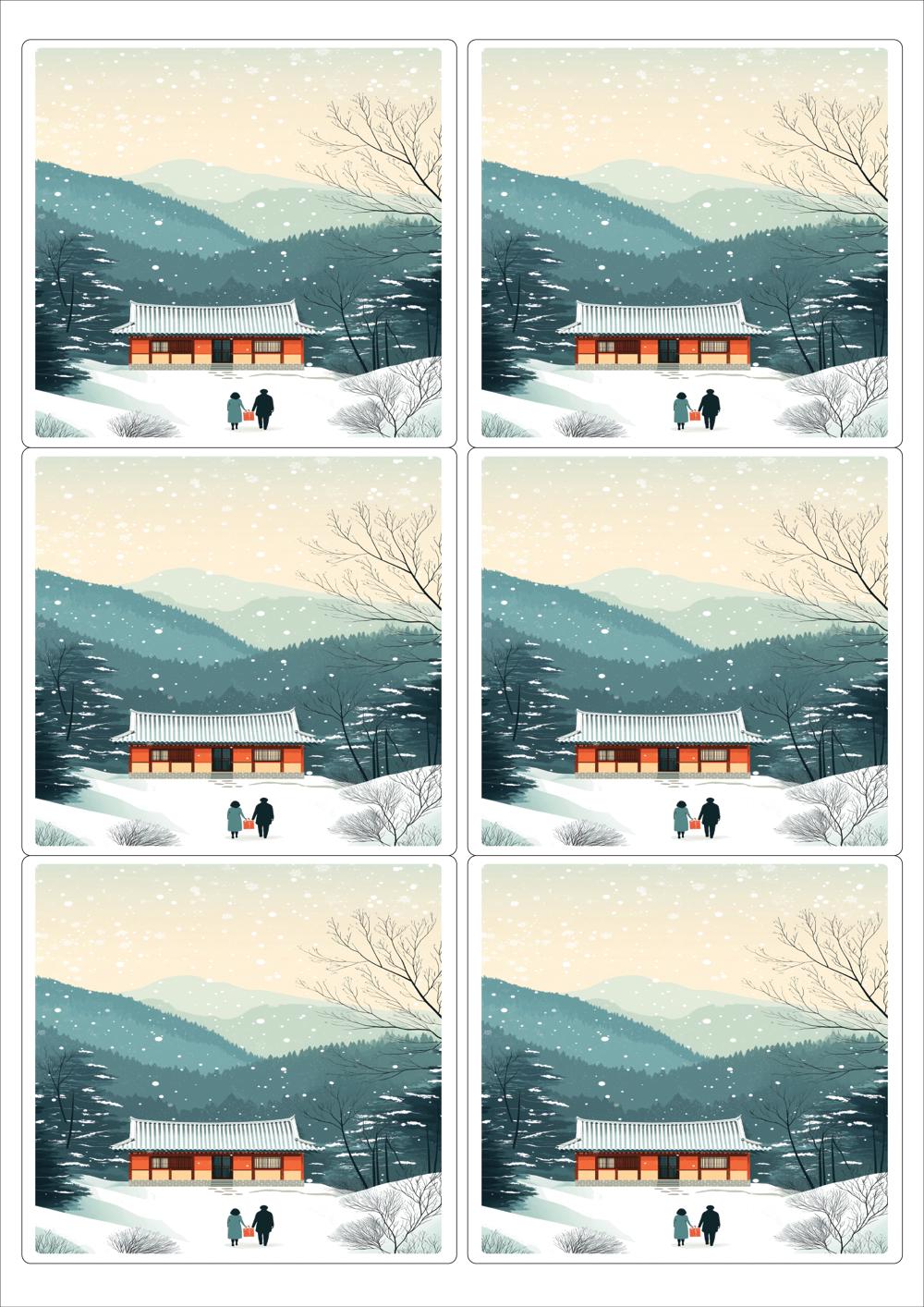 디자인된 A4 라벨지 출력용 라벨스티커, 규격코드: 223, 디자인코드: DA1577(귀향, 눈내리는 설날), 98.8 x 92.7 (mm)
