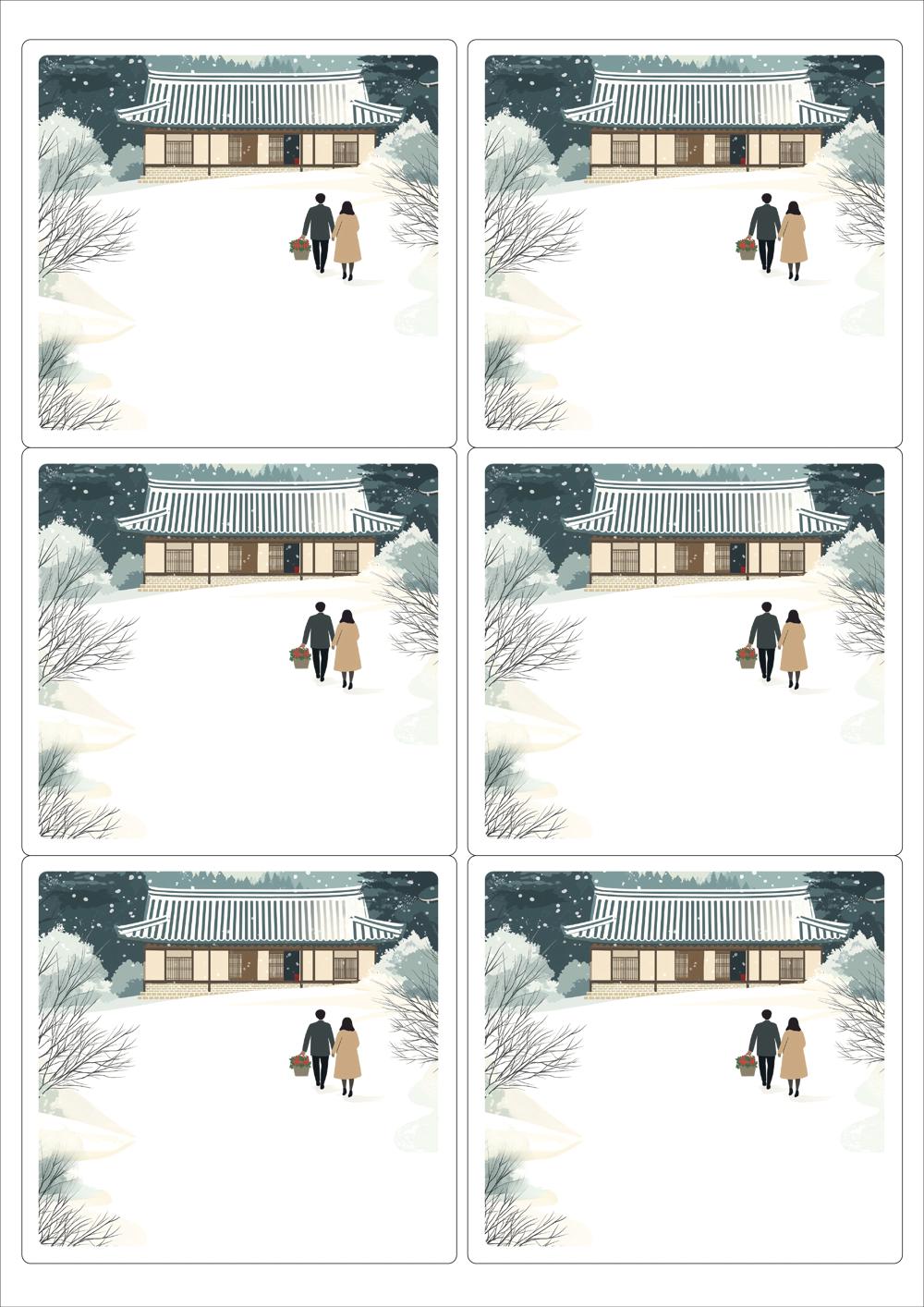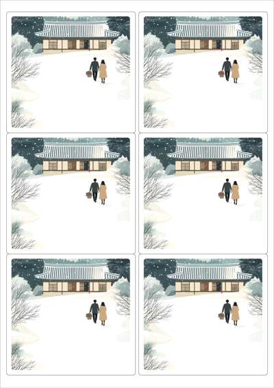 디자인된 A4 라벨지 출력용 라벨스티커, 규격코드: 223, 디자인코드: DA1580(눈내린 귀향의 따뜻한 길), 98.8 x 92.7 (mm)