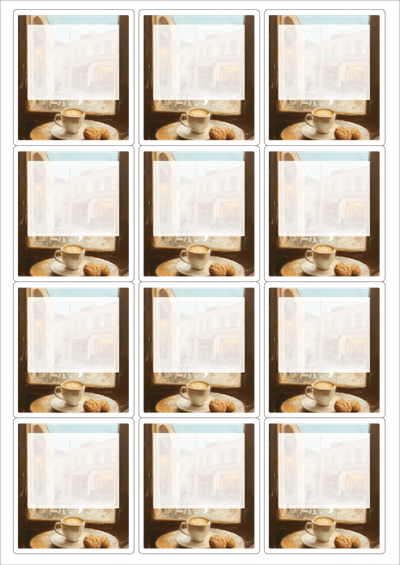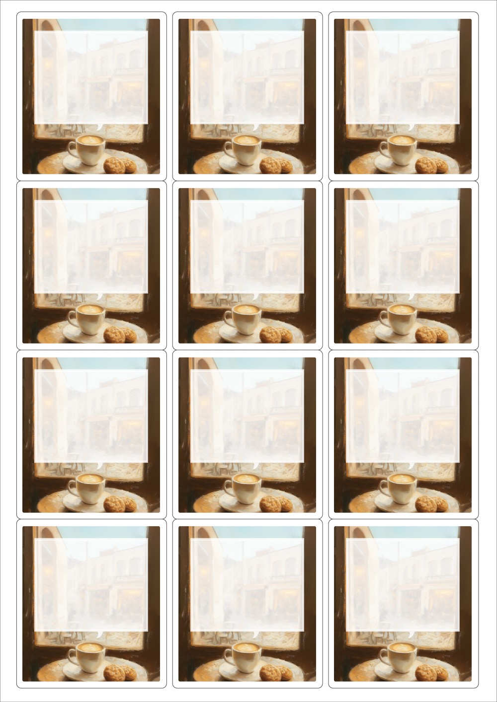 디자인된 A4 라벨지 출력용 라벨스티커, 규격코드: 234, 디자인코드: DA1479(레트로 감성 카페에서), 63.4 x 71.53 (mm)