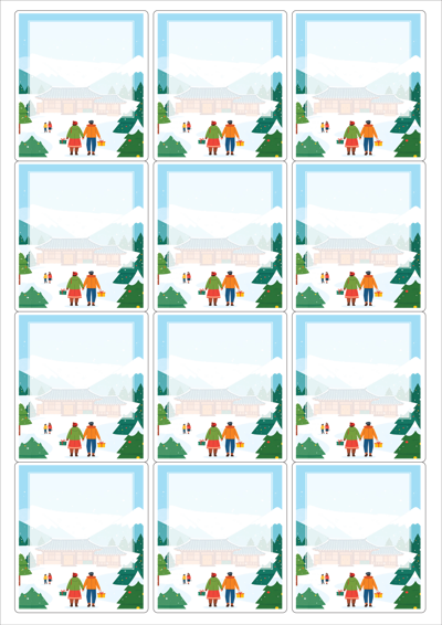 디자인된 A4 라벨지 출력용 라벨스티커, 규격코드: 234, 디자인코드: DA1569(설레는 설날의 아침), 63.4 x 71.53 (mm)