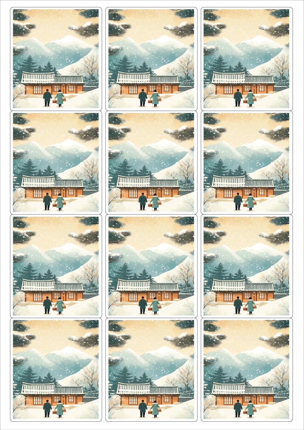 디자인된 A4 라벨지 출력용 라벨스티커, 규격코드: 234, 디자인코드: DA1575(설, 따뜻한 귀향), 63.4 x 71.53 (mm)