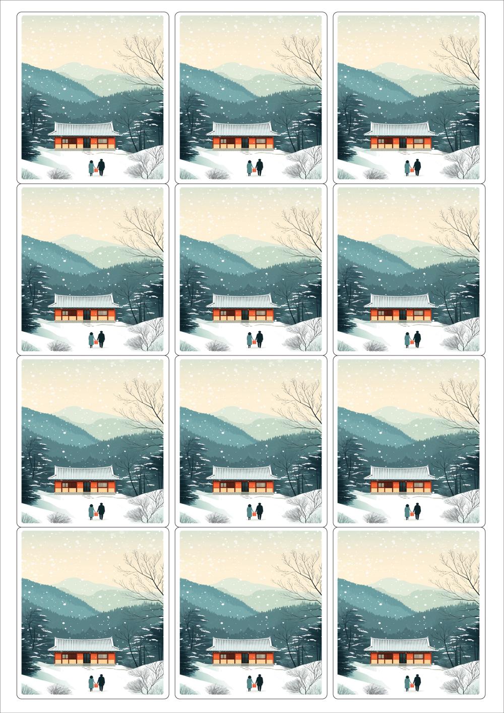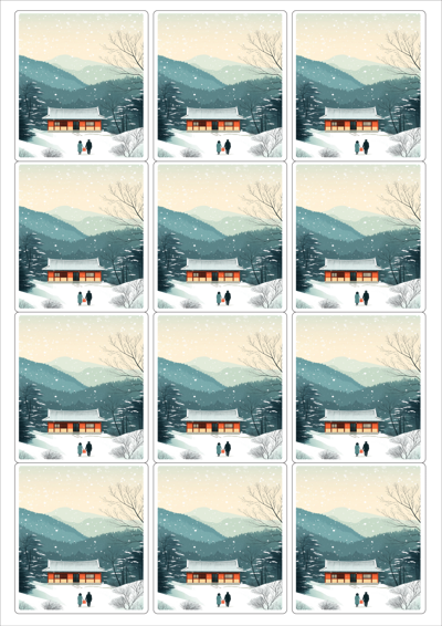 디자인된 A4 라벨지 출력용 라벨스티커, 규격코드: 234, 디자인코드: DA1577(귀향, 눈내리는 설날), 63.4 x 71.53 (mm)