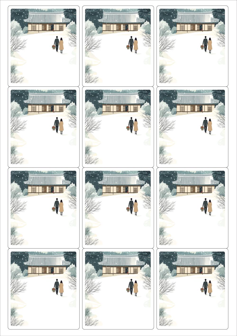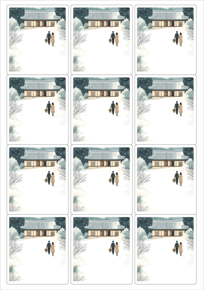 디자인된 A4 라벨지 출력용 라벨스티커, 규격코드: 234, 디자인코드: DA1580(눈내린 귀향의 따뜻한 길), 63.4 x 71.53 (mm)