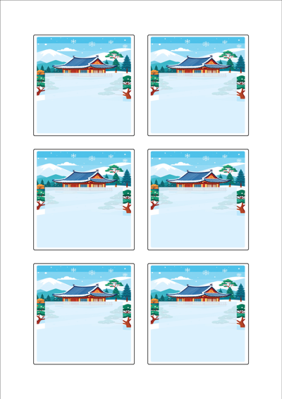 디자인된 A4 라벨지 출력용 라벨스티커, 규격코드: 423, 디자인코드: DA1567(설날의 아침1), 75 x 75 (mm)