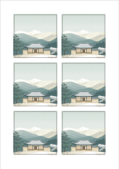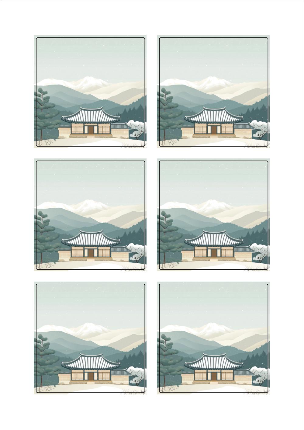 디자인된 A4 라벨지 출력용 라벨스티커, 규격코드: 423, 디자인코드: DA1578(고요한 설날의 아침), 75 x 75 (mm)