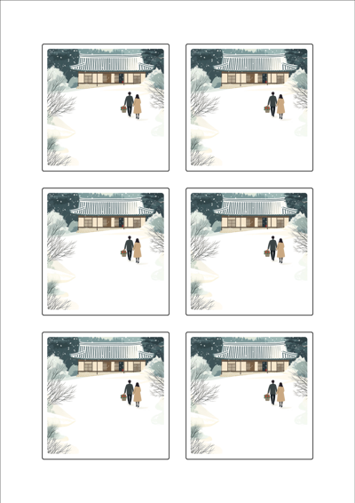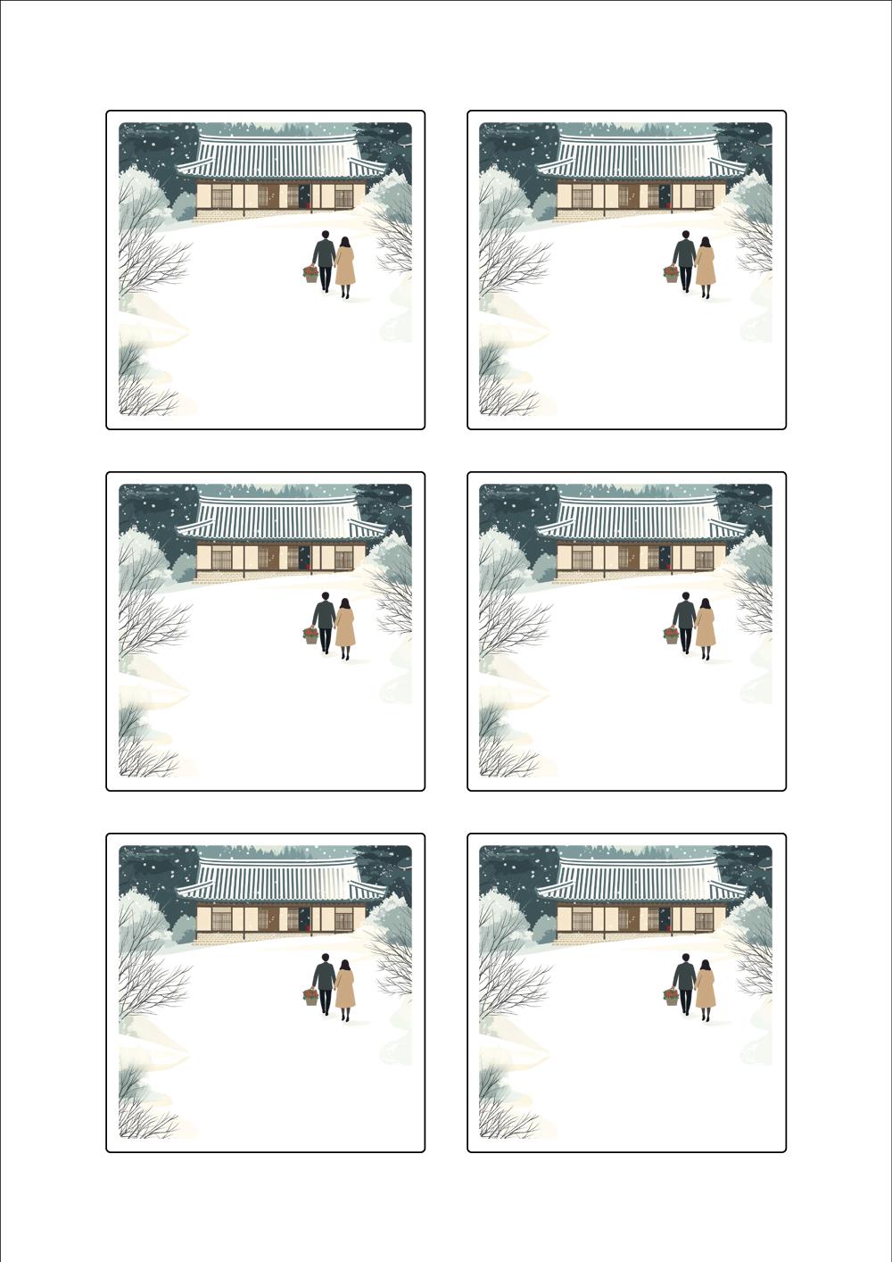 디자인된 A4 라벨지 출력용 라벨스티커, 규격코드: 423, 디자인코드: DA1580(눈내린 귀향의 따뜻한 길), 75 x 75 (mm)