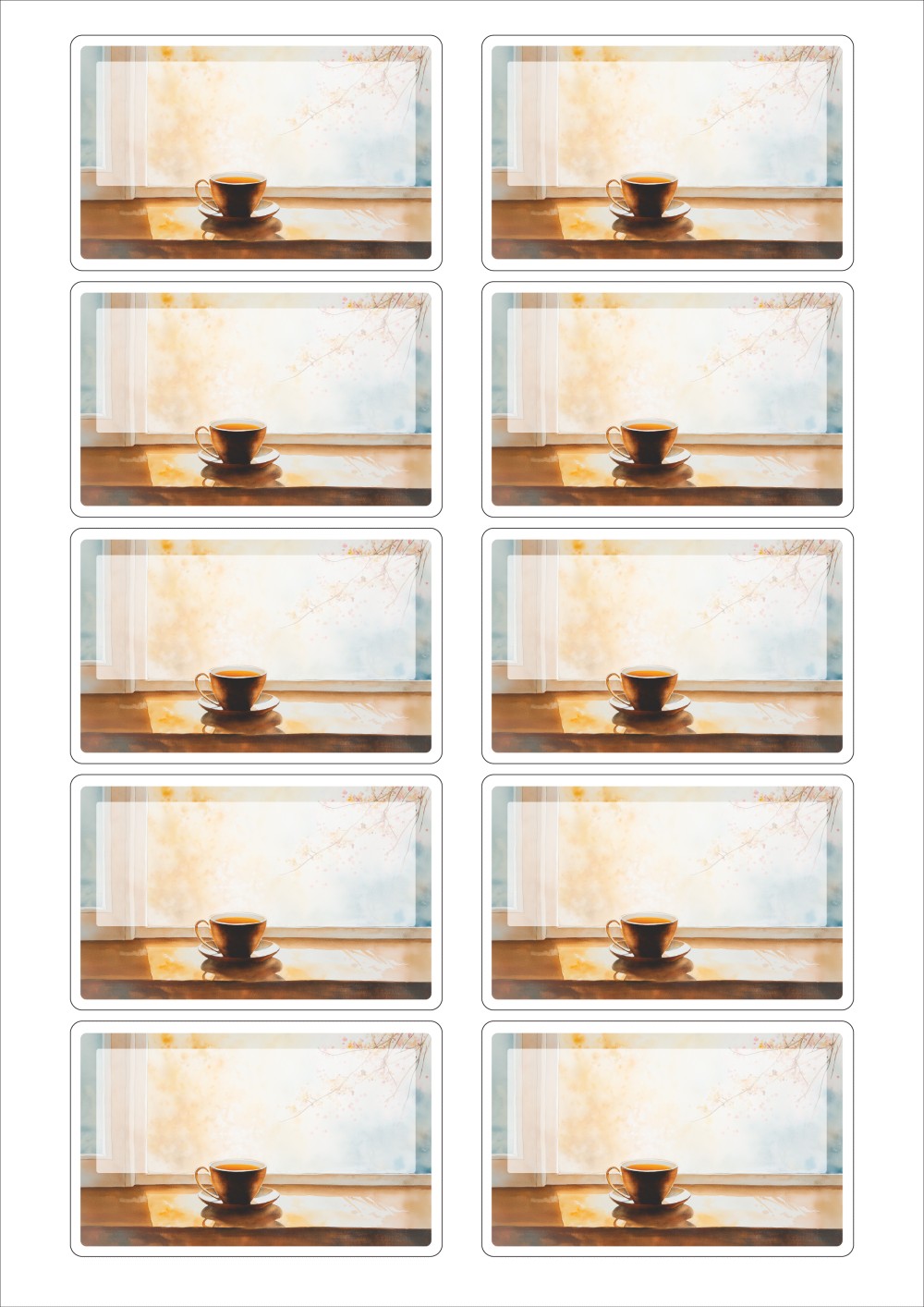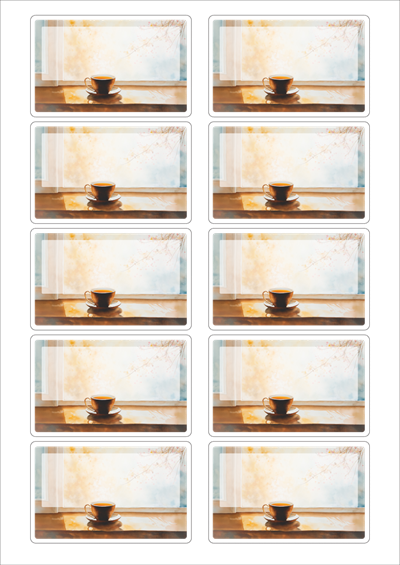 디자인된 A4 라벨지 출력용 라벨스티커, 규격코드: 425, 디자인코드: DA1425(가을날의 카페 창가에서), 84.5 x 53.5 (mm)