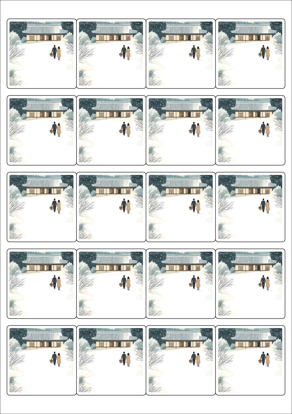 디자인된 A4 라벨지 출력용 라벨스티커, 규격코드: 445, 디자인코드: DA1580(눈내린 귀향의 따뜻한 길), 50 x 50 (mm)