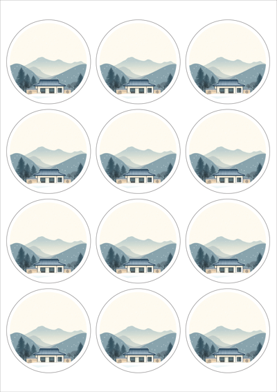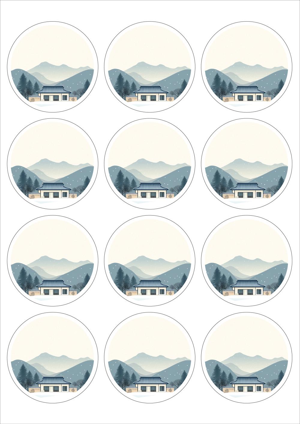 디자인된 A4 라벨지 출력용 라벨스티커, 규격코드: 534, 디자인코드: DA1581(설날의 감사의 인사), Φ63.7 (mm) 원형