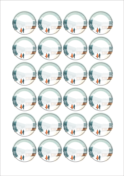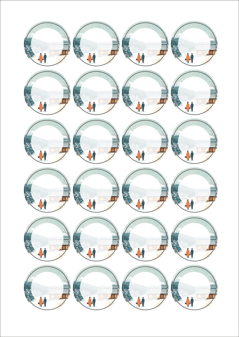 디자인된 A4 라벨지 출력용 라벨스티커, 규격코드: 546, 디자인코드: DA1579(설레는 귀향, 눈내리는 설날), Φ38.1 (mm) 원형