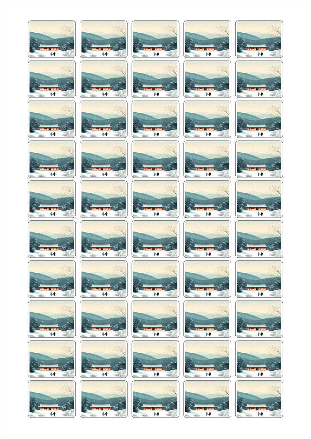 디자인된 A4 라벨지 출력용 라벨스티커, 규격코드: 550, 디자인코드: DA1577(귀향, 눈내리는 설날), 32 x 25.05 (mm)