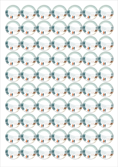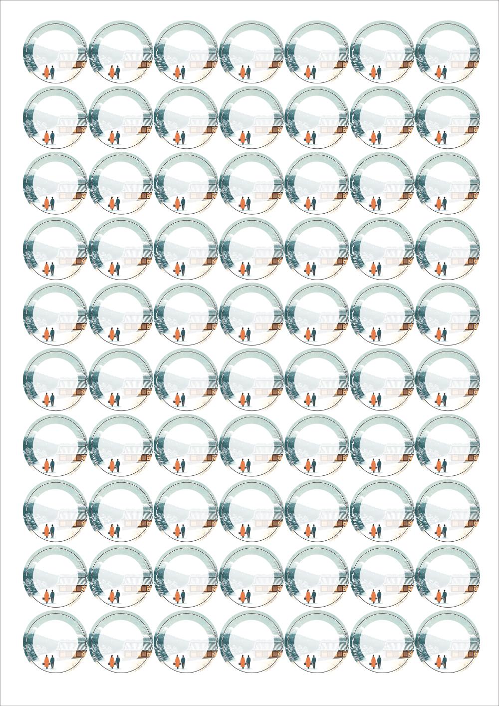 디자인된 A4 라벨지 출력용 라벨스티커, 규격코드: 570, 디자인코드: DA1579(설레는 귀향, 눈내리는 설날), Φ25 (mm) 원형