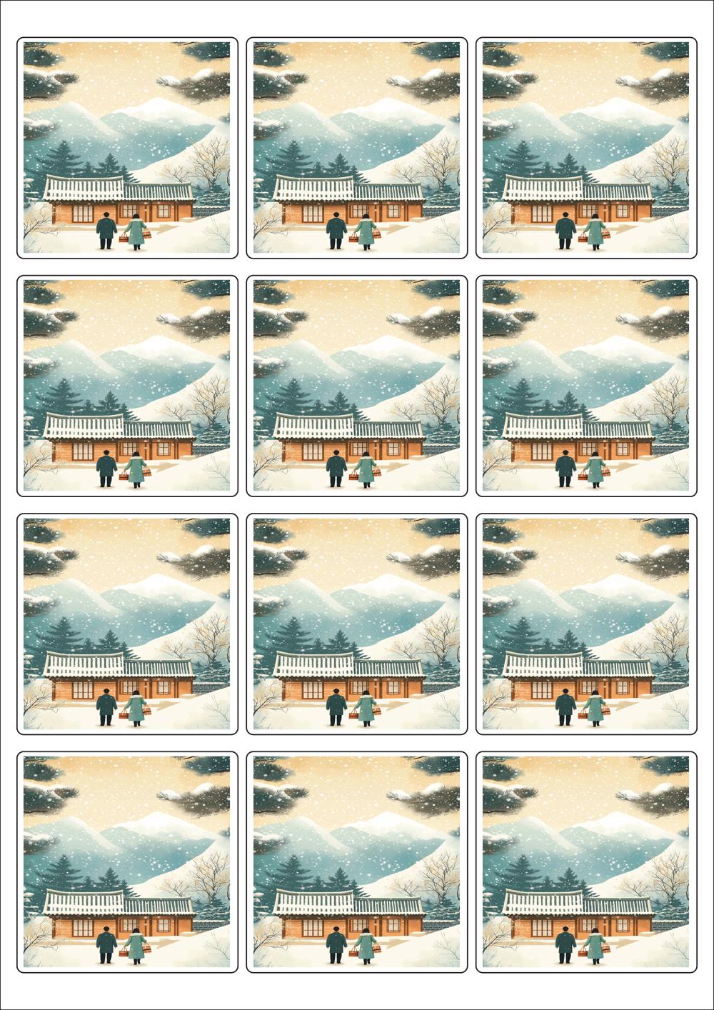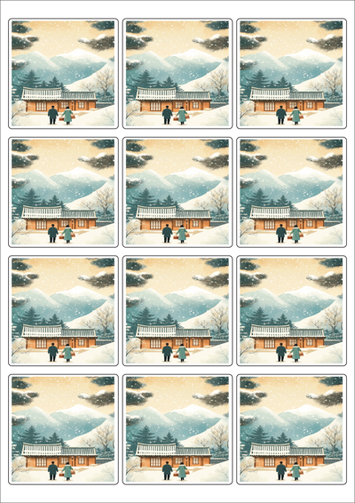 디자인된 A4 라벨지 출력용 라벨스티커, 규격코드: 834, 디자인코드: DA1575(설, 따뜻한 귀향), 65 x 65 (mm)