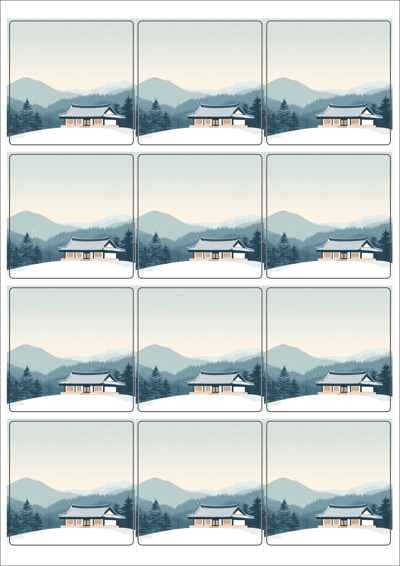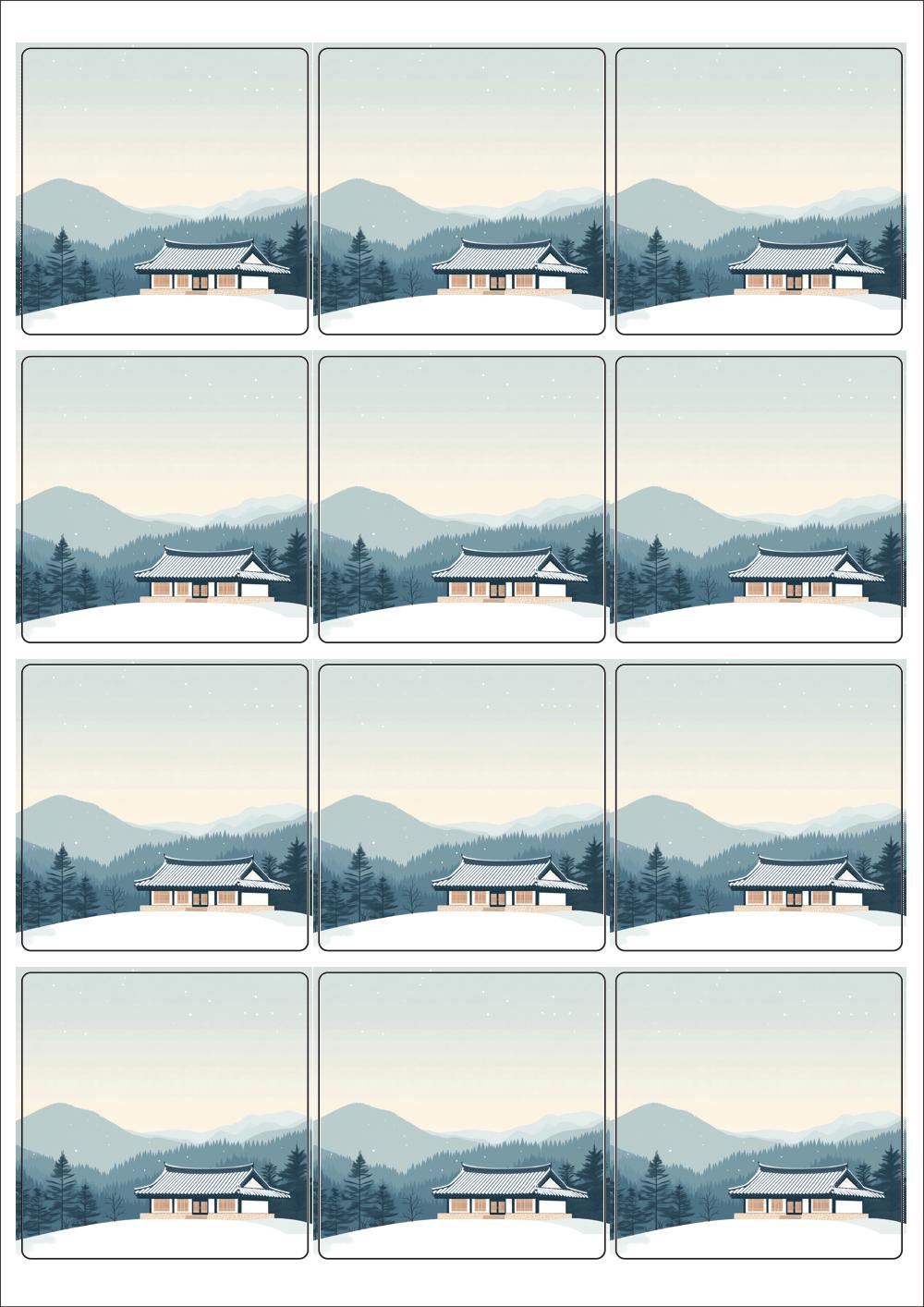 디자인된 A4 라벨지 출력용 라벨스티커, 규격코드: 834, 디자인코드: DA1576(고요한 마음과 다정한 인사), 65 x 65 (mm)