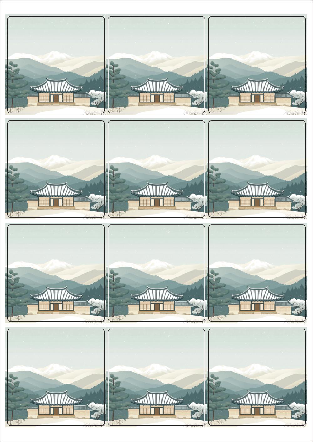 디자인된 A4 라벨지 출력용 라벨스티커, 규격코드: 834, 디자인코드: DA1578(고요한 설날의 아침), 65 x 65 (mm)