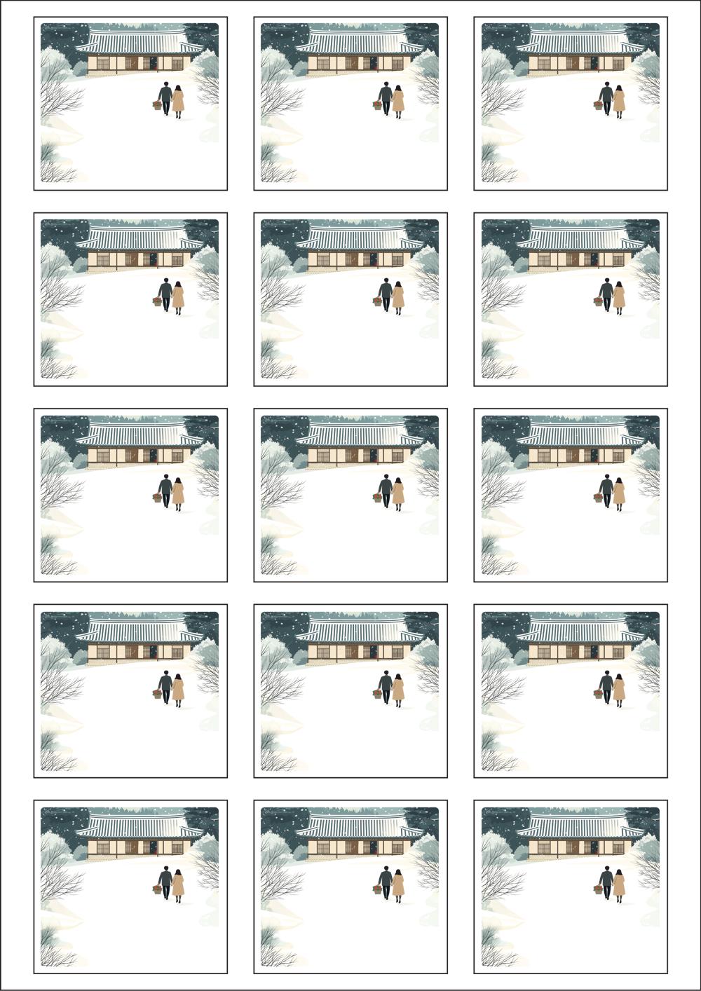 디자인된 A4 라벨지 출력용 라벨스티커, 규격코드: 935, 디자인코드: DA1580(눈내린 귀향의 따뜻한 길), 58 x 52 (mm)