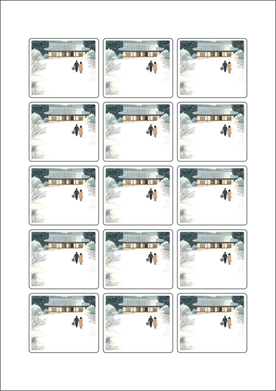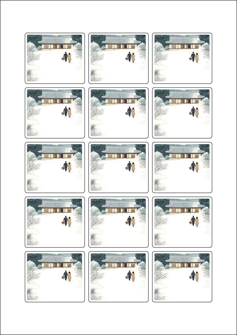 디자인된 A4 라벨지 출력용 라벨스티커, 규격코드: 953, 디자인코드: DA1580(눈내린 귀향의 따뜻한 길), 53 x 45 (mm)