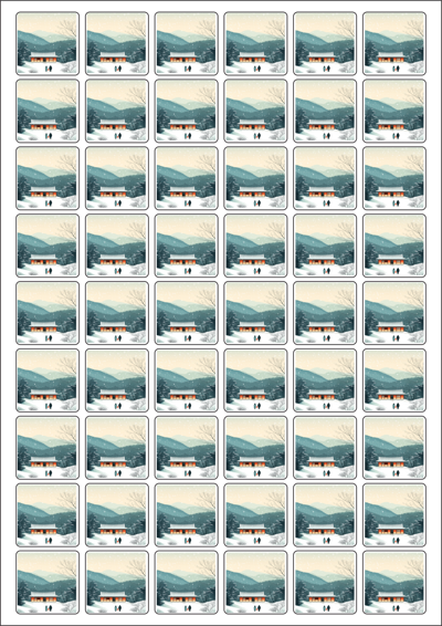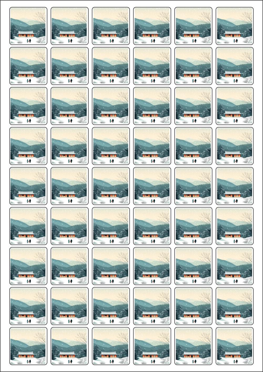 디자인된 A4 라벨지 출력용 라벨스티커, 규격코드: 954, 디자인코드: DA1577(귀향, 눈내리는 설날), 30 x 30 (mm)