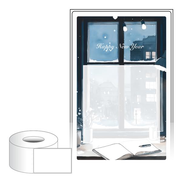 출력용 롤타입 스티커 디자인 라벨지, 규격코드: RL80124, 디자인코드: DA1503(겨울 창가에서, 해피뉴이어), 80 x 124 (mm) , 지관: 75mm