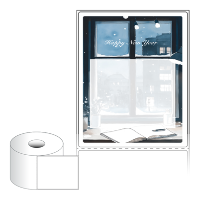 출력용 롤타입 스티커 디자인 라벨지, 규격코드: RS100124, 디자인코드: DA1503(겨울 창가에서, 해피뉴이어), 100 x 124 (mm) , 지관: 40mm