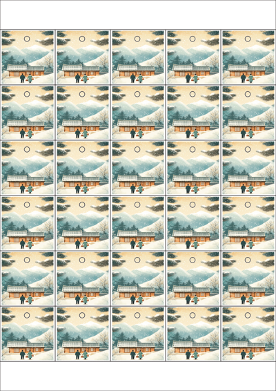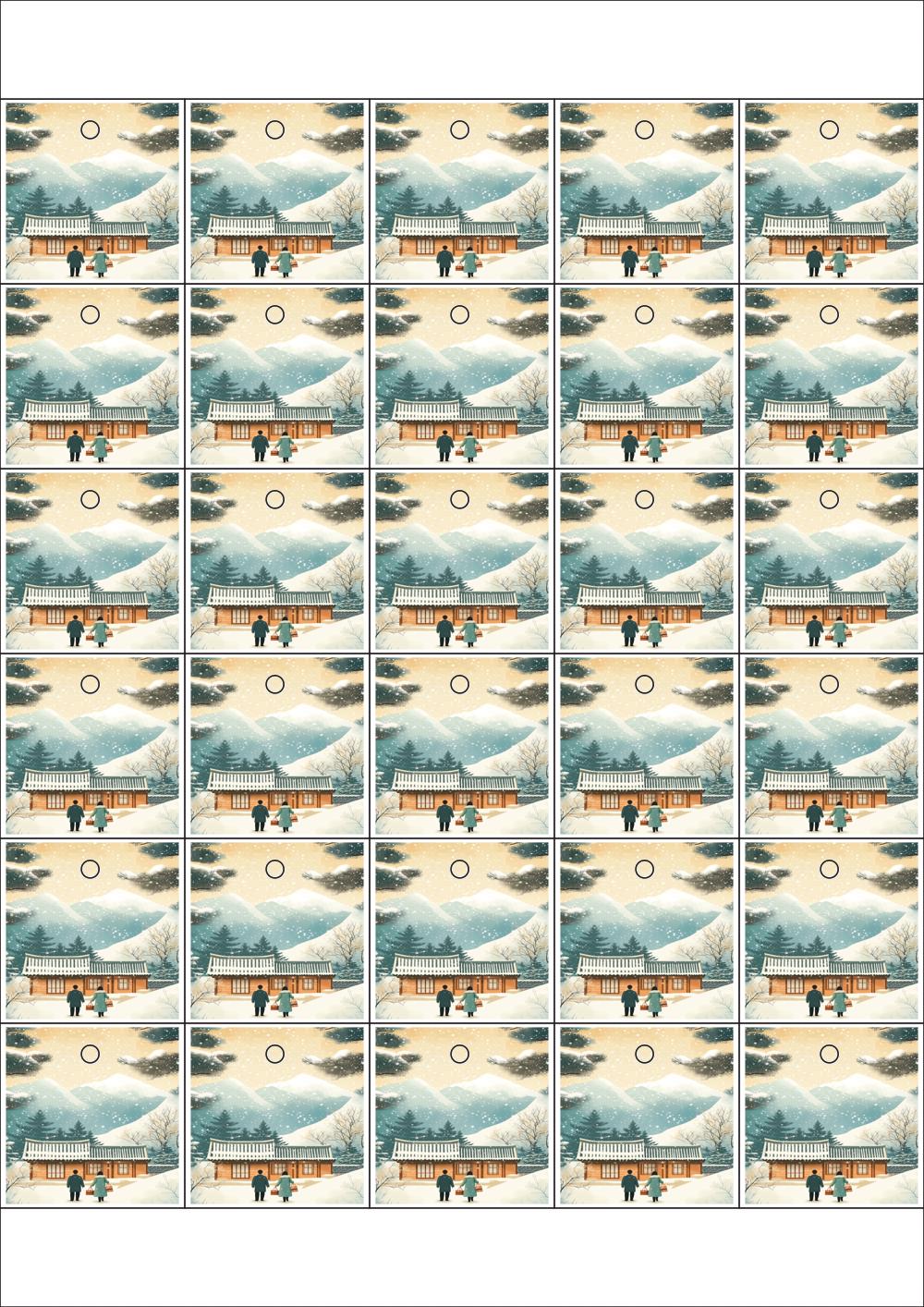 디자인된 A4 택 출력용 비점착 라벨, 규격코드: TLH0301, 디자인코드: DA1575(설, 따뜻한 귀향), 42 x 42 (mm)
