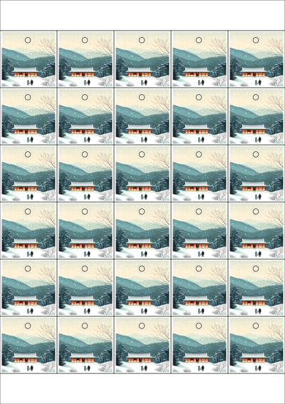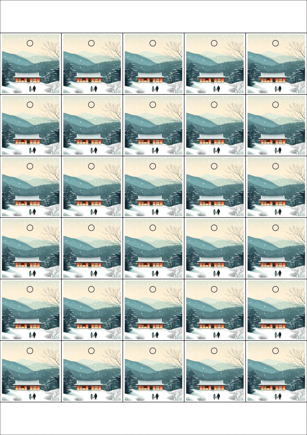 디자인된 A4 택 출력용 비점착 라벨, 규격코드: TLH0301, 디자인코드: DA1577(귀향, 눈내리는 설날), 42 x 42 (mm)