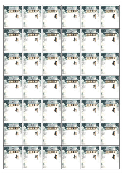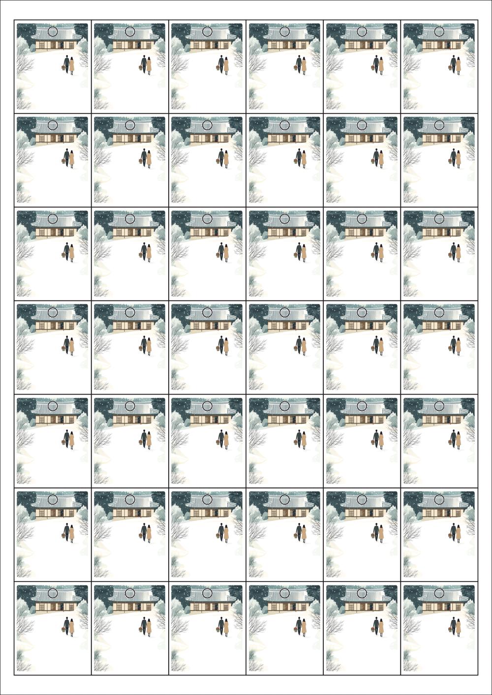 디자인된 A4 택 출력용 비점착 라벨, 규격코드: TLH0421, 디자인코드: DA1580(눈내린 귀향의 따뜻한 길), 33 x 40 (mm)