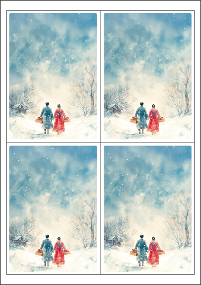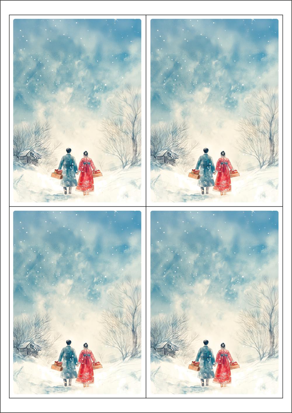 디자인된 A4 택 출력용 비점착 라벨, 규격코드: TLS0042, 디자인코드: DA1520(설레는 맘을 담은 설날), 98.5 x 138 (mm)