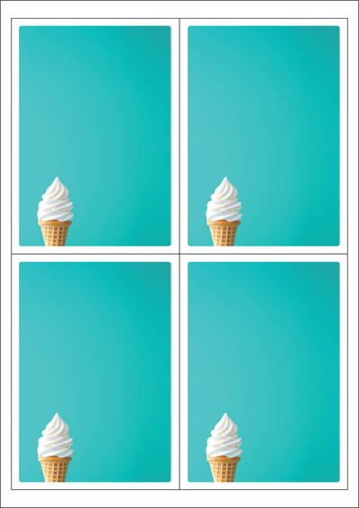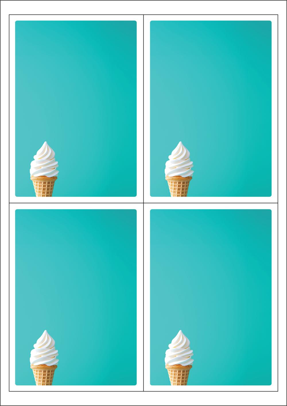 디자인된 A4 택 출력용 비점착 라벨, 규격코드: TLS0042, 디자인코드: DA1532(민트방에서 먹는 소프트 아이스크림), 98.5 x 138 (mm)